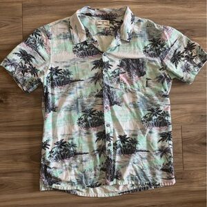 Tropical Hawaiian print short sleeve shirt. Features palm trees and ocean scenes. Perfect for casual outings.