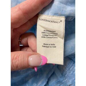 Excellent condition, brand tag one side is undone, otherwise no flaws or signs of wear, size XS. LoveShackFancy Ruffle Mini Skirt Pacific Indigo Hand Dye Blue Tie Dye. Fully lined. Smocked elastic waistband with raw-cut ruffle trim. Lightweight tiered fabric. Lace trim. Cotton