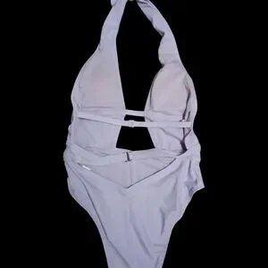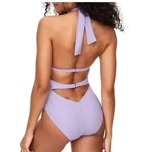 Stylish lavender one-piece swimsuit with a deep V-neck and cutout design. Perfect for beach days.