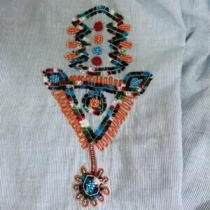 ▪️ Women’s Bohemian Style Top: V neckline, pullover, striped pattern, beaded embroidered abstract accents, and long sleeves. Pre-owned. Wear it with your favorite pants!
