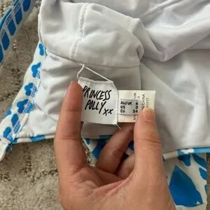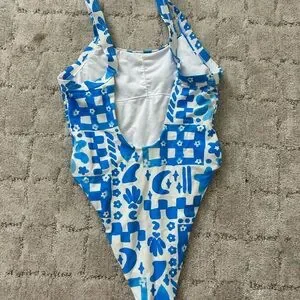 Dive into style with this Princess Polly one-piece swimsuit, featuring a bold blue and white geometric pattern. The classic cut and thin straps offer a timeless look, while the vibrant colors ensure you stand out at the pool or beach.