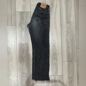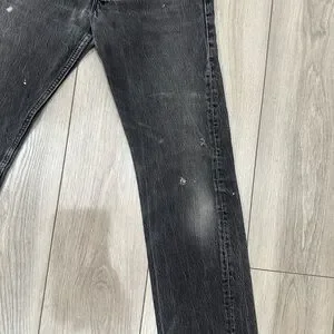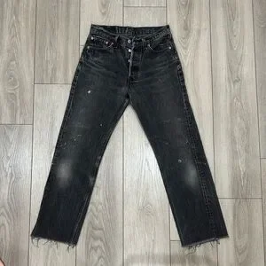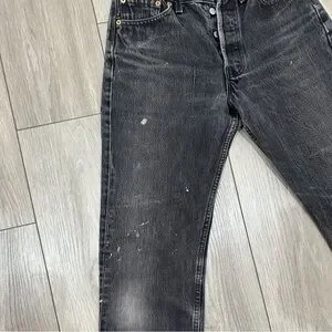 Rare vintage Levi’s! This special edition pair of 501 “Student” jeans features a beautifully faded black wash with a naturally worn-in look. There are some light paint splatters throughout, adding extra character and a cool, lived-in vibe.