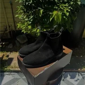These black suede Chelsea boots boast a sleek silhouette and classic elastic side panels. The minimalist design and monochromatic look make them a versatile choice for any occasion.