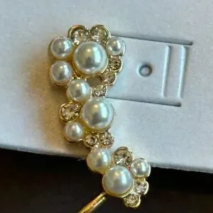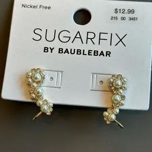 These BaubleBar earrings feature a stunning climber design that elegantly follows the curve of the earlobe. Crafted in a luxurious gold tone, they are adorned with sparkling white crystals and simulated pearls that add a touch of glamour to any ensemble. Perfect for both casual and formal occasions, these earrings are a chic addition to your jewelry collection. Super fun and sparkly! Brand new.