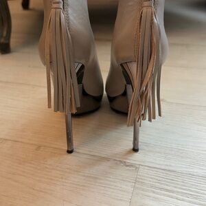 Step out in style with these elegant beige high heel booties. Featuring a chic peep toe design and a sleek silhouette with a tassel zipper closure at the back, these shoes are perfect for any occasion.
