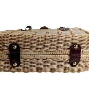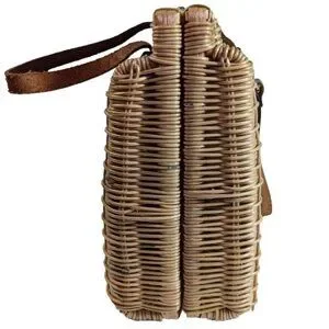 Hand crafted in Hong Kong with artisan variations in a natural light tan wicker base, complemented by leather and brass accents.