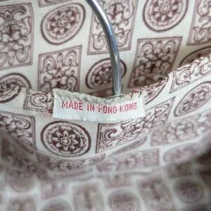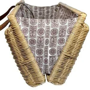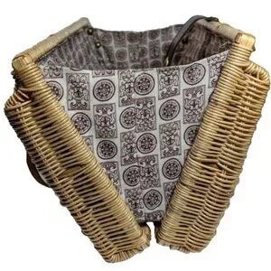 Vintage 50s 60s Handwoven Wicker Basket Purse Handbag Fabric Lining Leather and Brass Accents Hong Kong