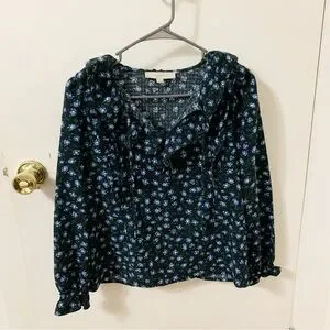 Good Condition. Chic floral blouse by LOFT. Features a black base with blue floral pattern. Perfect for casual or office wear. Ruffle tie neck detail. Long blouson sleeves. Pull on. 97% Polyester, 3% spandex.