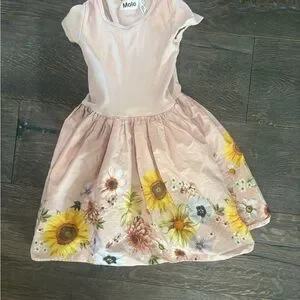 Embrace a cheerful spring vibe with this Molo sundress, featuring a soft pink hue and charming flutter cap sleeves. The classic crew neck and fitted waist flow into a fuller skirt, adorned with a vibrant floral print along the hem. Crafted from a light fabric, this dress offers a feminine silhouette perfect for casual outings.