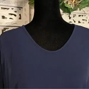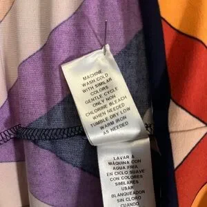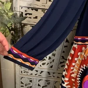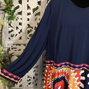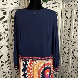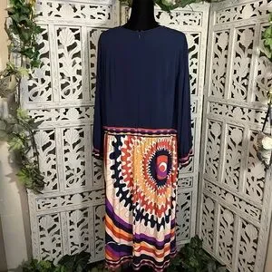 DONNA MORGAN Nice navy blue with groovy multicolors long sleeve plus size maxi dress, absolutely adorable design & style, solid navy blue top (attached) with skirt purple orange & cream dynamite pattern, cute colors at end off sleeves, nice blousy fit, modest vneck, long zipper in back, great condition, no snags tears or discoloration, see all pics per additional description… flat approx measurements (Sz/3X) (avg bust 52/56) (pit to pit 26”) (shoulder to shoulder 21”) (waist 48/52) (hips 62”) (length 47”)