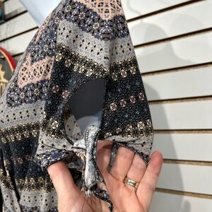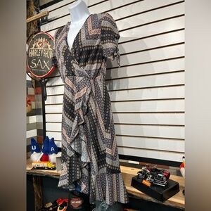 V-neck wrsp-style dress has shades of blue, gray, cream, etc. Lined in slate blue.