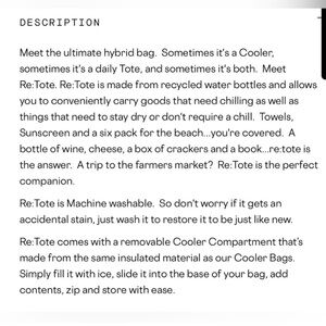 Corkcicle re:tote bag is a large sturdy tote with a cooler insider. It is in gently used condition. Also comes with a mesh laundry bag for easy washing.