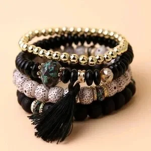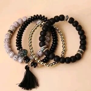 This stunning bracelet set features elegant gold and black beads, perfect for any occasion. The intricate design adds a touch of sophistication to your outfit.