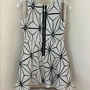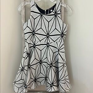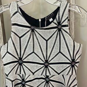 This chic dress by Hannah Banana features a bold black and gray geometric pattern, ideal for fun special events. The sleeveless design and fit and flare silhouette offers a flattering and stylish look. Its modern design ensures a versatile addition to any wardrobe.