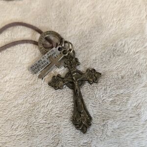 Elegant bronze cross pendant on a brown cord. Features additional metal charms for a unique look.