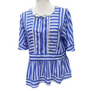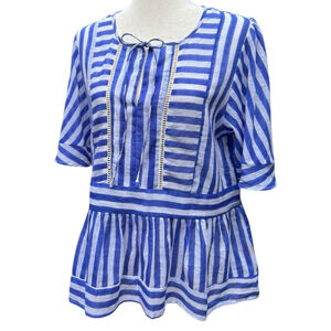 Elevate your warm-weather wardrobe with this breezy and beautiful Oliphant striped blouse in a size Medium. Crafted from 100% cotton and made in India, this lightweight top features a flattering peplum hem, soft elbow-length sleeves, and a charming bow-tie neckline. The vertical and horizontal blue and white stripes create a coastal vibe, while the delicate front trim adds a feminine, boho-chic touch.