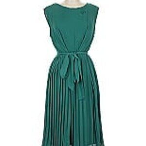 Vintage style teal fit and flare dress with a pleated skirt and belted waist. Great condition. Hits just below the knee. Great for weddings, brunch, or the office. 100% polyester.