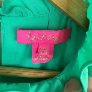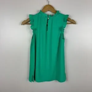 This elegant blouse by Lilly Pulitzer showcases a sleeveless design with charming ruffled accents at the neckline and armholes. Crafted in a vibrant green hue, it offers a flowing silhouette perfect for dressy-casual occasions.