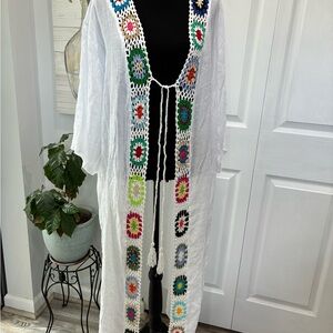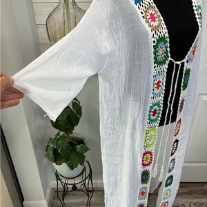 White crochet kimono featuring vibrant multicolor accents. Perfect for layering or Beach Cover Up.
