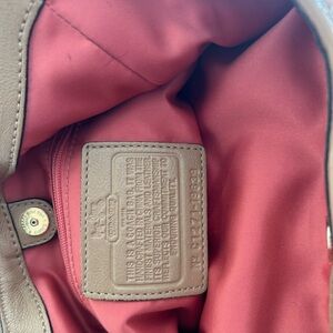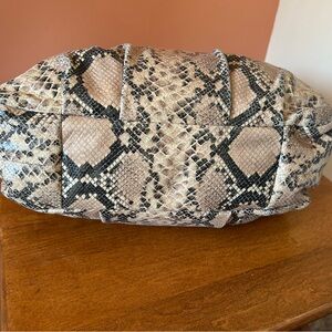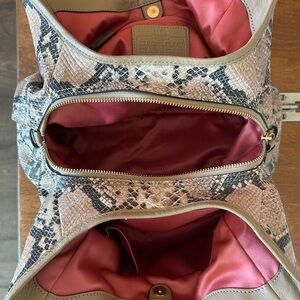 Fantastic, timeless shoulder bag by COACH in a gorgeous black on tan textured snakeskin pattern. Features three compartments-middle zip portion with snap portion on either side, one with an interior zip pocket, one with two interior open pockets. Gold toned hardware, wonderful coral interior. Comes with brown dust bag. Approximate measurements: height: 10”, length=13”, depth=4”, strap drop=10.5”. Tag no: C1271-19639. This beauty is not to be missed and in great condition!