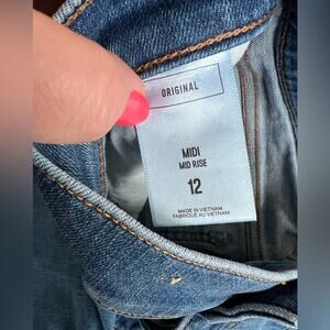 Express medium wash cut off frayed “midi” mid rise shorts size 12