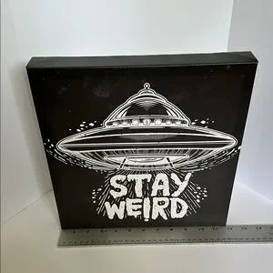 Unique black and white canvas art featuring a UFO design with 'Stay Weird' text. Perfect for adding a quirky touch to any space.