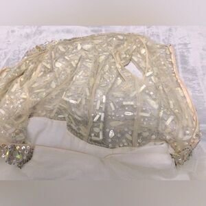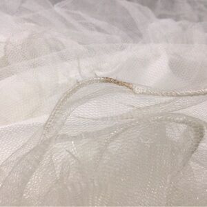 Preloved. Good condition. It has an off white coloring that makes it hard to tell if there is discoloration on the front. The inside has some yellowing and loose stitches. There is also a small stain on the hem of the mess layer of the dress. Some of the beading is loose as well. All can be seen in the photos.