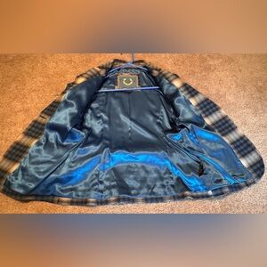 Elevate your wardrobe with this stylish plaid blazer. Featuring a classic design, it's perfect for any occasion. The blue and cream colors add a sophisticated touch. Great condition, size Medium. 3/4 sleeve with G hardware on the sleeves. I love the color of this blazer and the inside is just as pretty as the outside!đź’™