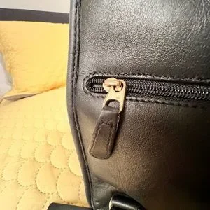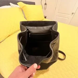 Sleek black leather backpack. Features adjustable straps. Elegant and versatile design.