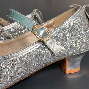 Add a touch of sparkle to your child's outfit with these stunning silver dress shoes. Perfect for special occasions, these shoes feature a charming bow detail with a hook & loop closure (but looks like a buckle). The heel is 1.2 inches. These are a size 5 (big kid) with a 9.5 inch insole. They are barely worn as they were purchsed for a cruise and worn two nights on the ship before growing out of them for the next dressy occasion.