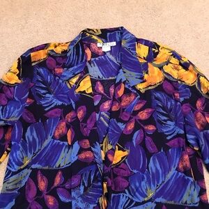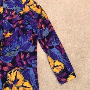 Colorful blazer with bold floral patterns. Features shades of purple, blue, black and yellow.