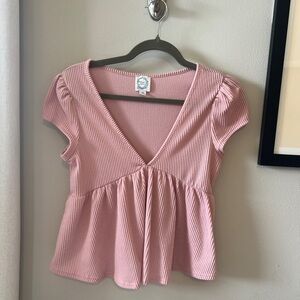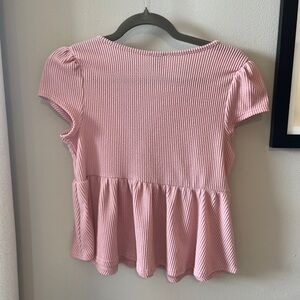 This stylish pink blouse from Francesca's Collections showcases a flattering peplum design with charming puff sleeves. The cap sleeves and fitted silhouette create a chic and contemporary look, perfect for any occasion.
