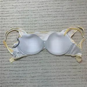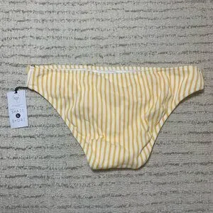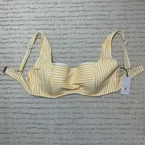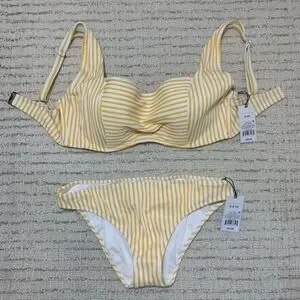 Shade & Shore brand bikini set (top and bottom included). Mango yellow and white color, ribbed texture. New with tags including hygienic liner. Top features extra wide adjustable straps and underwire cups in size 34DD. Bottoms are size M (8-10).