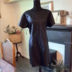 This elegant black faux leather dress offers a sleek and sophisticated look. Perfect for any occasion, it combines style with comfort.