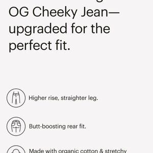 We updated the Original Cheeky® Jean with an even higher rise, a straighter leg, and a raised back-hook seam. Plus, it features our signature Happy Pockets, which are set higher and closer together for an even bouncier, lifted look. Even better? It’s made of our cleanest denim fabric yet.* Not afraid of a French tuck or cropped tee, she’s an all-season girlie, ready for anything.