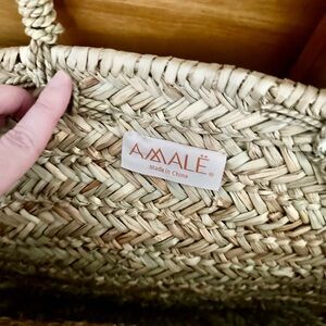 This Amale accessory is a stylish half-moon bag featuring a natural woven base in tan straw, adorned with vibrant pom-poms. The playful design and curved handle make it a perfect choice for adding a whimsical touch to your summer outings.
