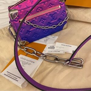 Experience the elegance of Louis Vuitton with this crossbody bag, featuring a stunning pink-to-purple gradient and the iconic LV monogram. The luxurious texture and sleek design make it a perfect accessory for any occasion.
