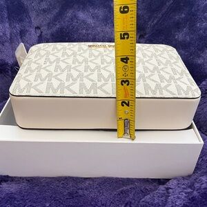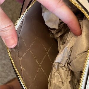 Elegant shoulder bag with cream monogram pattern. Gold-tone logo detail. Includes branded strap.