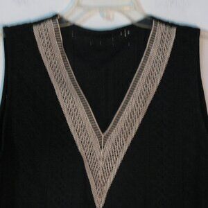 Emery Rose blouse in size large. New with tags NWT, this black top has a rich eyelet pattern, may be slightly see thru due to pattern. Gorgeous embroidery at the neckline in tan, beige. Sleeveless for all your summer occasions. V neckline. Made from 95% polyester and 5% spandex, machine wash.