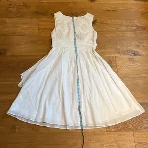 Lined. Ruching at waist. Attached tie can be tied in front or back. Back zip. No flaws. In perfect, never worn condition.