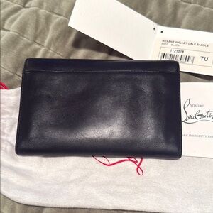 Stylish black wallet featuring a silver accent and Christian Louboutin signature red interior. It has many interior pockets and card slots and an exterior pocket on the back.