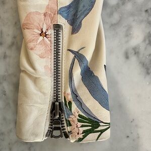 This Alice + Olivia “Cody” motorcycle jacket features a striking red, blue, yellow and green floral pattern, making it a standout piece in any wardrobe. The cropped design and luxurious sheen add a touch of elegance, perfect for pairing with high-waisted bottoms. Its unique botanical print offers a fresh take on classic moto styling. Super soft!