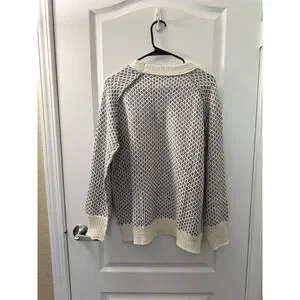 The Staccato pullover sweater in size L is designed for women and features a modern, chic style. It comes in a gray color with a geometric pattern and is made from a blend of cotton and polyester. The sweater has a crew neck, long raglan sleeves, and a ribbed texture. It offers a regular fit and this item is new with tags.