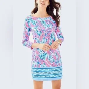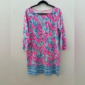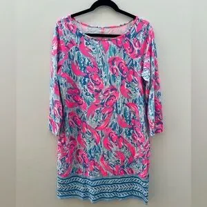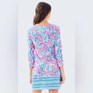Description: This beautitul Lilly Pulitzer Marlowe Dress in Cracked Up Cosmic Coral is a must-have for any fashion-forward woman. The dress features 3/4 sleeves and a short-length T-shirt style, perfect for any occasion. The dress is made from high-quality cotton material, ensuring both comfort and durability. This gorgeous dress is perfect from morning coffee runs to afternoon errands and poolside cocktails. Printed 3/4 Sleeve T-Shirt Dress with Cuffed Sleeves.