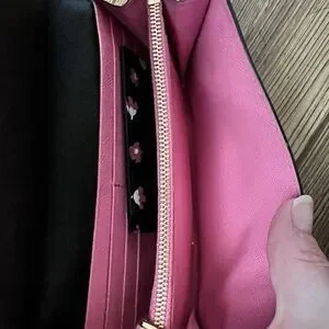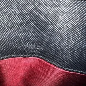 Black and multicolor Saffiano leather Prada wallet with gold-tone hardware, floral detail throughout, logo embellishment at front face, zip pocket at exterior back, pink leather lining, removable ID card slot, three compartments; one with zip closure, 12 card slots, four bill compartments and snap closure.