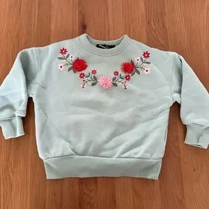 Charming sweatshirt with floral embroidery. Features red and pink flowers on a light green background.