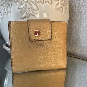 Balky gold leather wallet. Perfect for a stylish touch. Has some rubbing on the front and corners. In used condition.