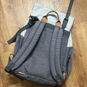 Eddie Bauer diaper bag. Just came out of the washing machine, no stains, leather on buckle and handle are perfect. Great bag. Has a line side pouch for keeping a bottle warm. Lots of hidden pockets. I loved it, but don’t have babies anymore.