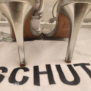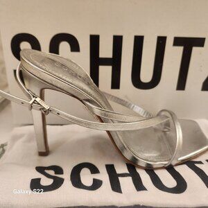 SCHUTZ "Heloise" Metallic Napa Leather Heeled Sandals. NIB. Size Various. Pics are of the 6.5, I have a size 9.5 and 7 in same box/condition. No rips/scuffs/tears/peeling. NIB/Original box/packaging. With dust bag. Some sticker residue on the base of one shoe, see final picture (not rips/or tears). Smoke free home. No odors. All offers are welcome. Thank you! Have two pair, one has the dust bag, one does not. Please let me know if you prefer the dust bag.