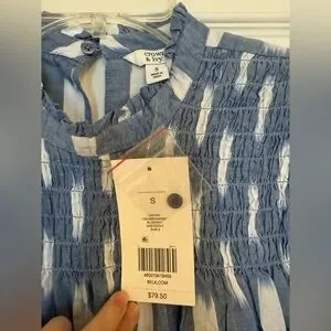 Charming mini dress featuring a playful blue and white pattern. Perfect for any occasion. Lightweight fabric offers a cool fit for a warm Summer day.